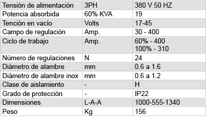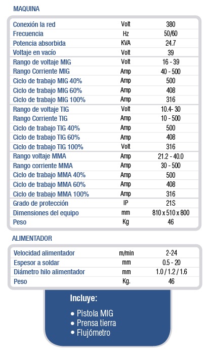 Incluye pistola Mig de 4,5 mts. con conexión europea, regulador, manguera de gas, pinza y cable toma tierra, todas las máquinas llevan temporizador para soldaduras por puntos y display de visualización de corriente de soldadura.